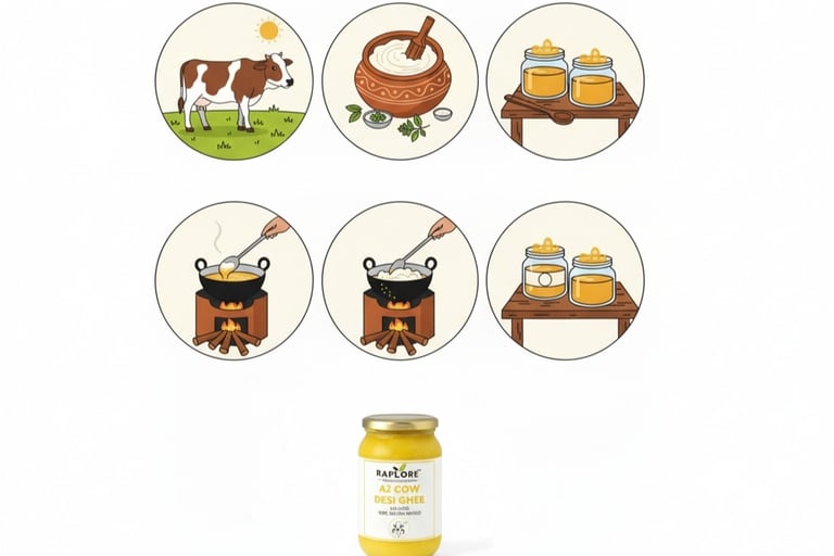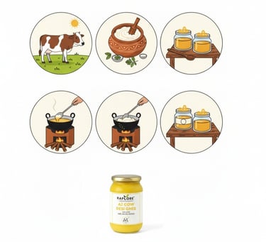 Hand-churned from A2 cow milk using the ancient bilona method, our ghee is slow-cooked to preserve its golden aroma and health benefits.